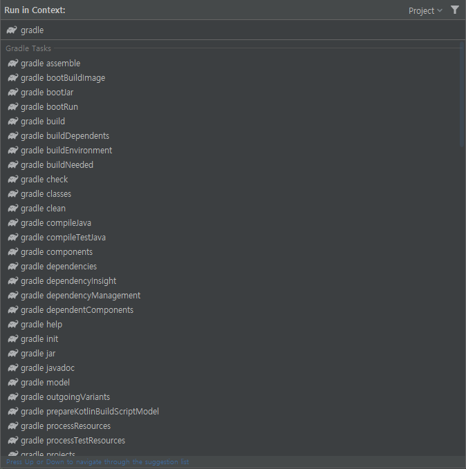Gradle 명령어를 잘 모를 때, Gradle Running 을 이용하여 자동완성하여 실행할 수 있다 - 아래 그림 참고